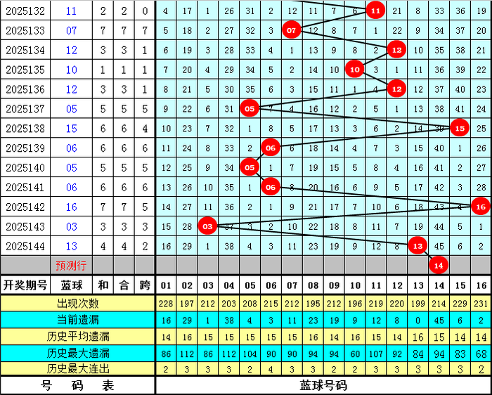 蓝球走势分析:上周二第25142期蓝球开出号码16,最近十周星期二蓝球号码大小比为3:7,奇偶比为4:6,012路比为5:3:2。本期蓝球重点关注偶数号,看好蓝球06、14。