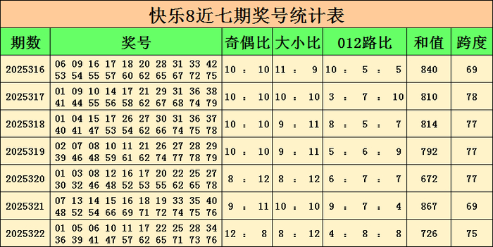 福彩快乐8上期开奖号码:01 05 06 10 11 17 22 25 28 34 36 39 41 47 57 62 65 71 73 76,其中奖号奇偶比为12:8,大小比为8:12,跨度为75。