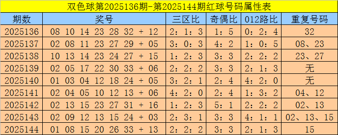 福彩双色球第2025144期奖号为:01 08 15 20 26 33 + 13,红球奇偶比为3:3,三区比为2:2:2,012路比为2:1:3,重号:15。