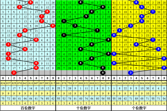 跨度:近5期跨度分布在3-9之间,振幅为7点,分布非常分散,上期跨度为3,下降3点,本期注意跨度走大,关注6区段。