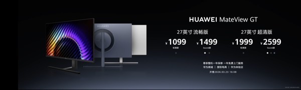 【CNMO科技消息】3月23日,华为正式发布全新MateView GT系列显示器,以27英寸为主打尺寸,推出流畅版与超清版等多个版本,售价从1099元起,于当日16:08在华为商城、授权电商及华为体验店同步开售。